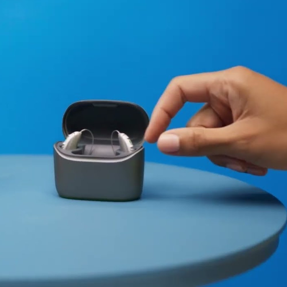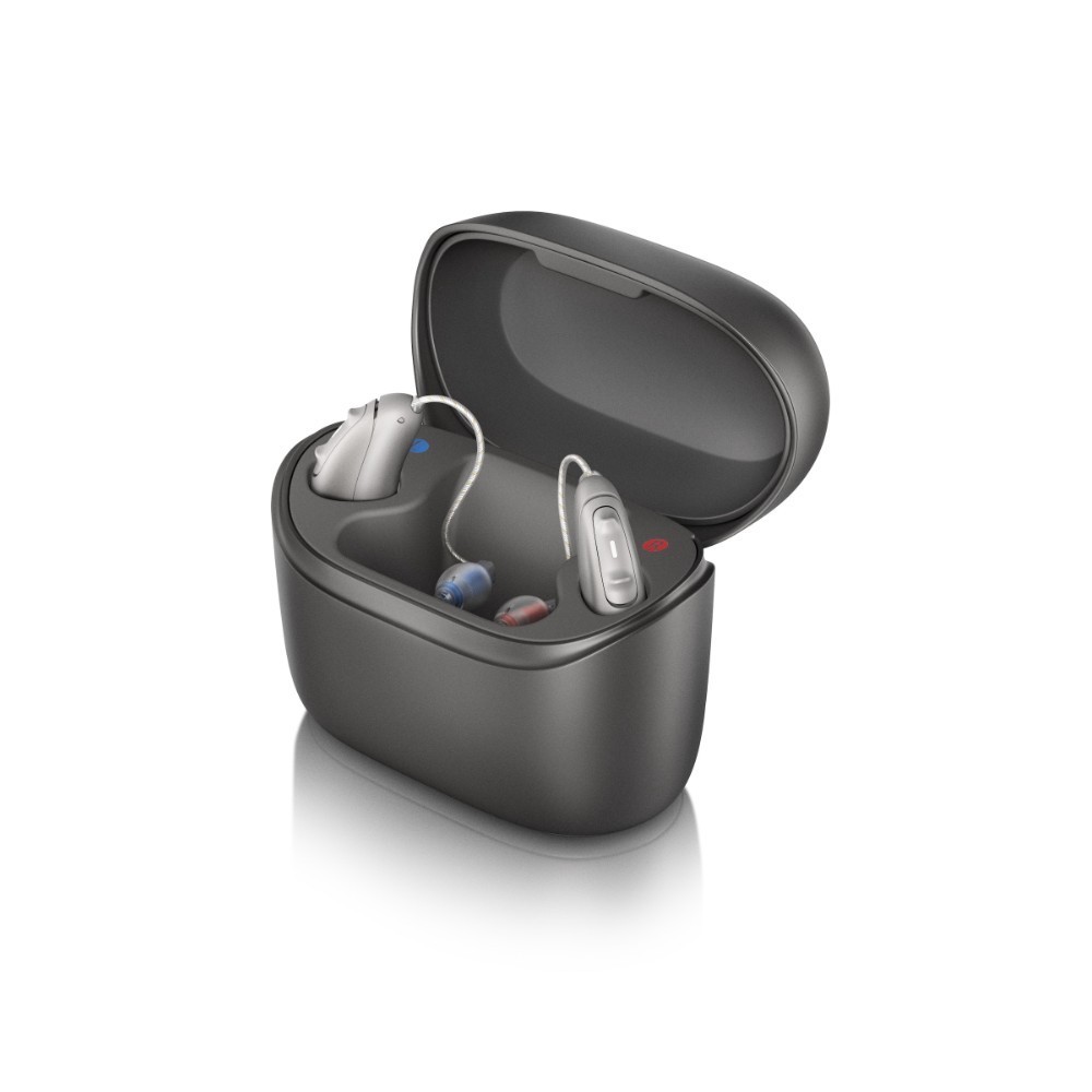 The Unitron Moxi V-R and Moxi V-RT, now part of the Vivante hearing aid range, boast ultra-thin rechargeable designs that seamlessly combine style and comfort with advanced functionality featuring a user-friendly charging case with a magnetic pull design for easy device insertion and removal.